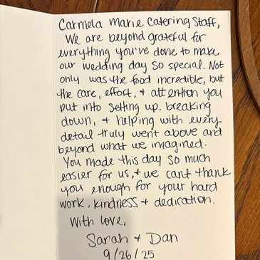 We are beyond grateful for everything you've done to make our wedding day so special. Not only was the food incredible, but the care, effort, and attention you put into setting up, breaking down, and helping with every details truly went above and beyond what we imagined.